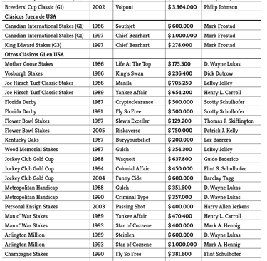 Su trayectoria fue de casi 23 años: debutó en 1984 y su última carrera fue una lamentable rodada con For A Player el 1 de febrero de 2007 en Aqueduct. Las cifras finales hablan por sí solas: 25.926 carreras corridas, 4.083 victorias, 3.657 segundos lugares y 3.588 terceros, acumulando 187.245.727 dólares en premios. Su porcentaje ganador fue del 16% y alcanzó un 44% de figuraciones.