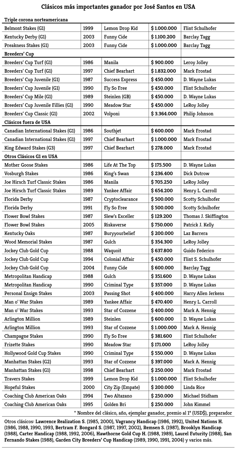 Los éxitos de Santos en Estados Unidos sorprenden aún más con el paso del tiempo. La revista The BloodHorse, fundada en 1916 y considerada la publicación más influyente en la industria del Pura Sangre, lo reconoció como el mejor jinete de la década de los 80.